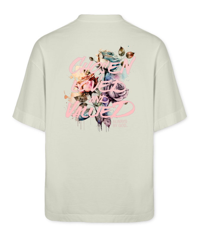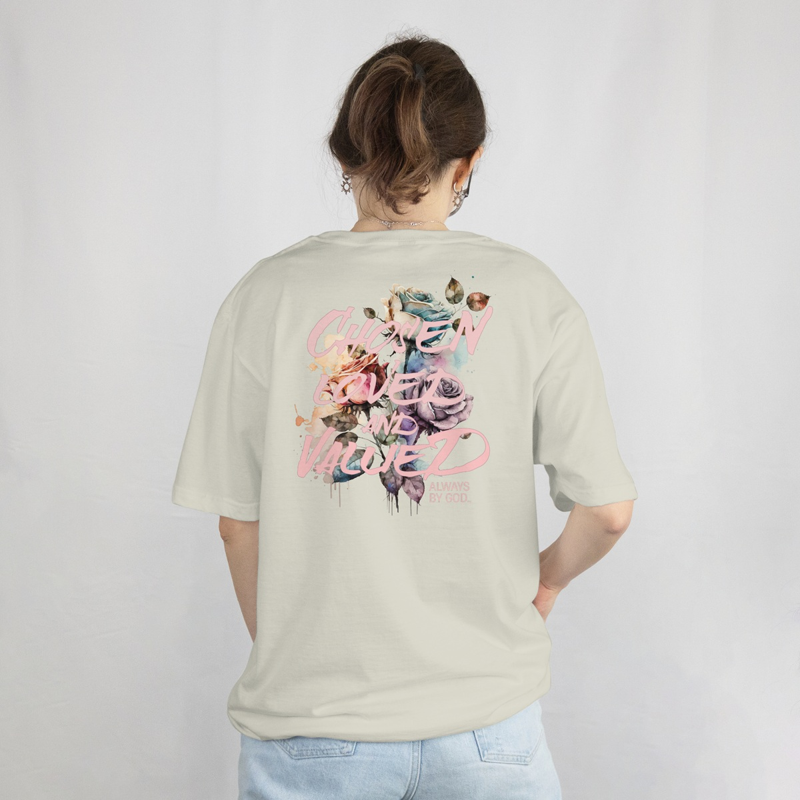 A camiseta FLOWERS: CHOSEN, LOVED & VALUED traduz o conceito da identidade cristã feminina: escolhida por Deus, amada sem limites e valorizada em cada detalhe. A arte exclusiva em aquarela floral representa a plenitude do amor divino florescendo no ambiente urbano, com tons suaves e harmonia visual. Modelagem super oversized, corte quadrado moderno e tecido 100% algodão premium garantem conforto e estilo para qualquer ocasião. A impressão DTG de alta qualidade preserva a essência das cores pastel e a beleza da arte. Vista seu propósito: cada compra apoia projetos sociais e leva fé além da moda. RHEINO – Moda urbana para quem crê e vive com autenticidade.