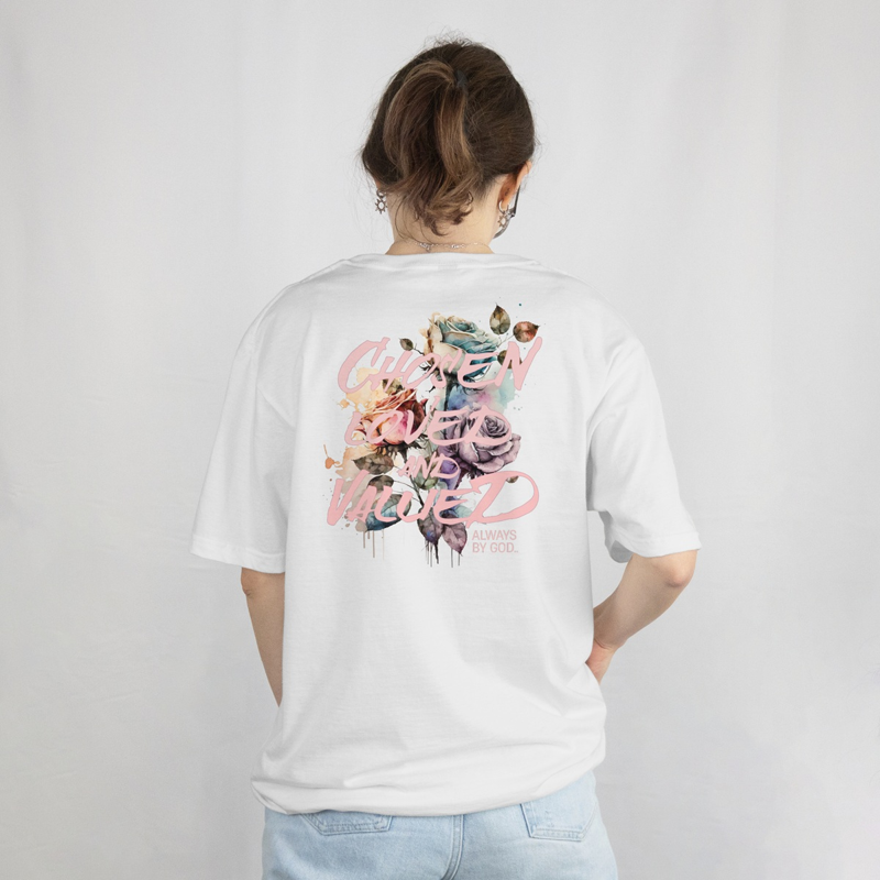 A camiseta FLOWERS: CHOSEN, LOVED & VALUED traduz o conceito da identidade cristã feminina: escolhida por Deus, amada sem limites e valorizada em cada detalhe. A arte exclusiva em aquarela floral representa a plenitude do amor divino florescendo no ambiente urbano, com tons suaves e harmonia visual. Modelagem super oversized, corte quadrado moderno e tecido 100% algodão premium garantem conforto e estilo para qualquer ocasião. A impressão DTG de alta qualidade preserva a essência das cores pastel e a beleza da arte. Vista seu propósito: cada compra apoia projetos sociais e leva fé além da moda. RHEINO – Moda urbana para quem crê e vive com autenticidade.