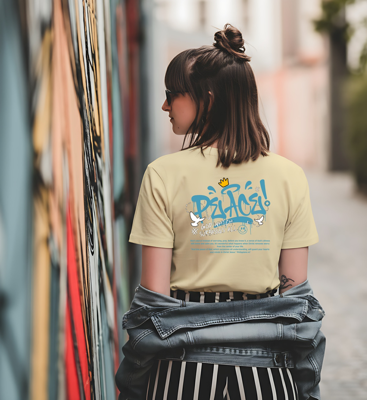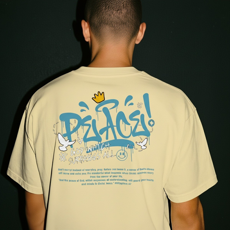 A camiseta PEACE traz uma declaração ousada de fé através do design graffiti urbano em dourado vibrante. Inspirada na paz que excede todo entendimento (Filipenses 4:7), esta peça representa o encontro entre a cultura street e a espiritualidade cristã, mostrando que a verdadeira paz vem de Cristo. O estilo graffiti com pingos e respingos comunica autenticidade urbana, enquanto o símbolo da estrela de quatro pontas simboliza a luz divina que orienta o caminho. Design pensado para homens que vivem a fé com intensidade nas ruas. Modelagem masculina confortável, corte tradicional e tecido 100% algodão premium garantem durabilidade e estilo para o dia a dia urbano. A impressão DTF de alta qualidade preserva a intensidade das cores e a autenticidade do design graffiti. Vista a paz que transforma: cada compra apoia projetos sociais e leva esperança às cidades. RHEINO – Moda urbana para quem crê e vive com autenticidade.