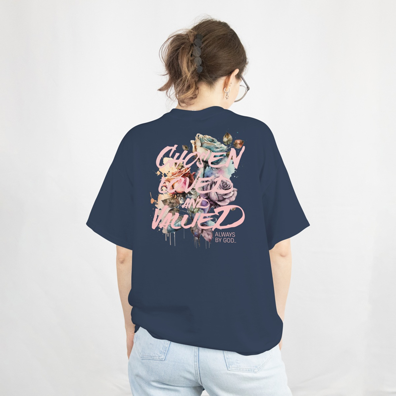 A camiseta FLOWERS: CHOSEN, LOVED & VALUED traduz o conceito da identidade cristã feminina: escolhida por Deus, amada sem limites e valorizada em cada detalhe. A arte exclusiva em aquarela floral representa a plenitude do amor divino florescendo no ambiente urbano, com tons suaves e harmonia visual. Modelagem super oversized, corte quadrado moderno e tecido 100% algodão premium garantem conforto e estilo para qualquer ocasião. A impressão DTG de alta qualidade preserva a essência das cores pastel e a beleza da arte. Vista seu propósito: cada compra apoia projetos sociais e leva fé além da moda. RHEINO – Moda urbana para quem crê e vive com autenticidade.